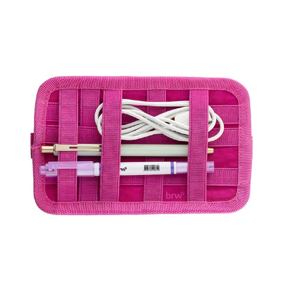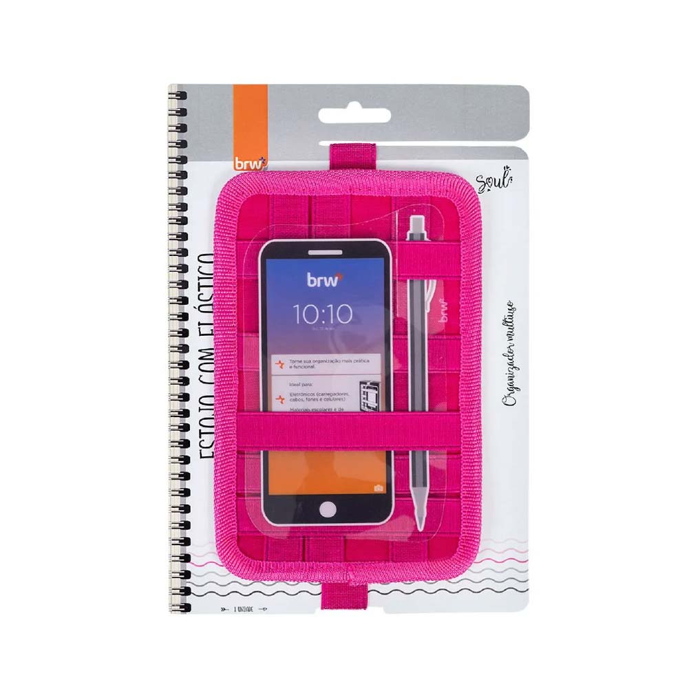 - BRW-ET-0163 – Estuche de nylon multi elástico | Banda elástica con ajuste para cuadernos y agendas A5 | Porta celular, audífonos, lápiz y bolígrafo | Color: rosa | 1 unidad.
