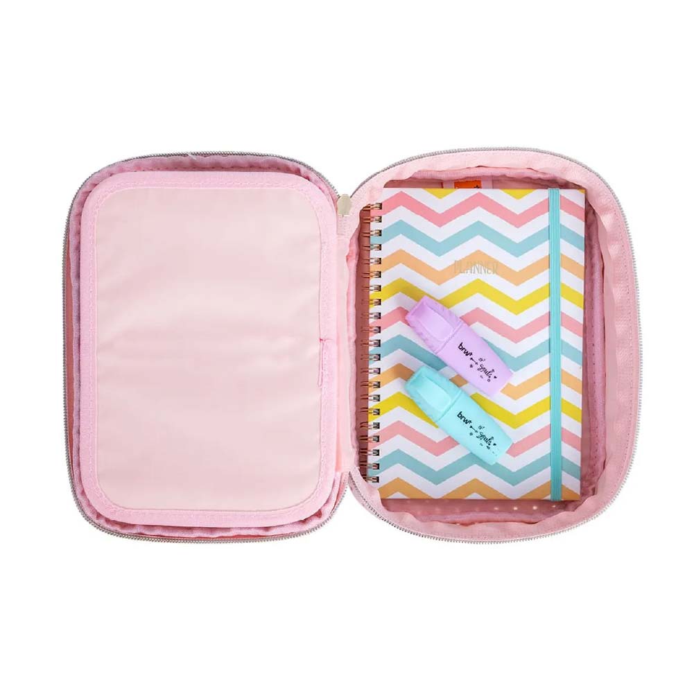 – Estuche grande perforado | Capacidad: 100 bolígrafos | Color: rosa | 1 cierre | 1 unidad.